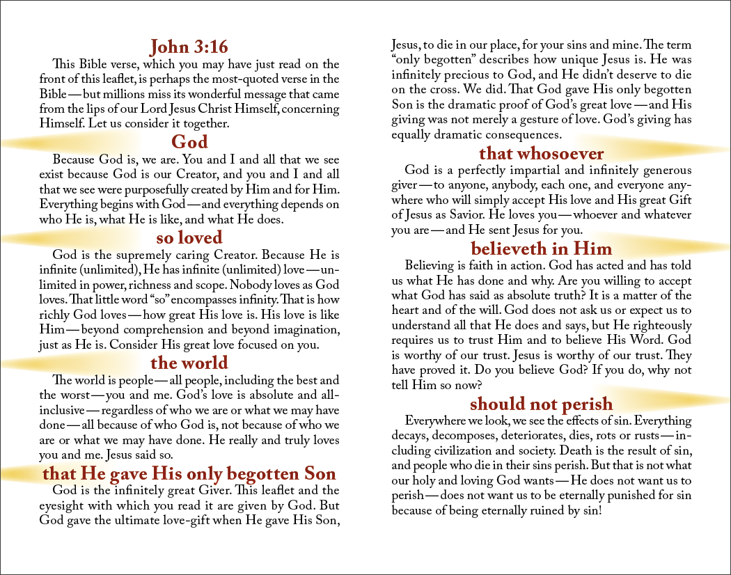 God is the infinitely great Giver. This leaflet and the eyesight with which you read it are given by God. But God gave the ultimate love-gift when He gave His Son, Jesus, to die in our place, for your sins and mine. The term “only begotten” describes how unique Jesus is. He was infinitely precious to God, and He didn’t deserve to die on the cross. We did. That God gave His only begotten Son is the dramatic proof of God’s great love — and His giving was not merely a gesture of love. God’s giving has equally dramatic consequences.
