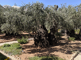 An ancient olive tree in the walled garden on the Mount of Olives.